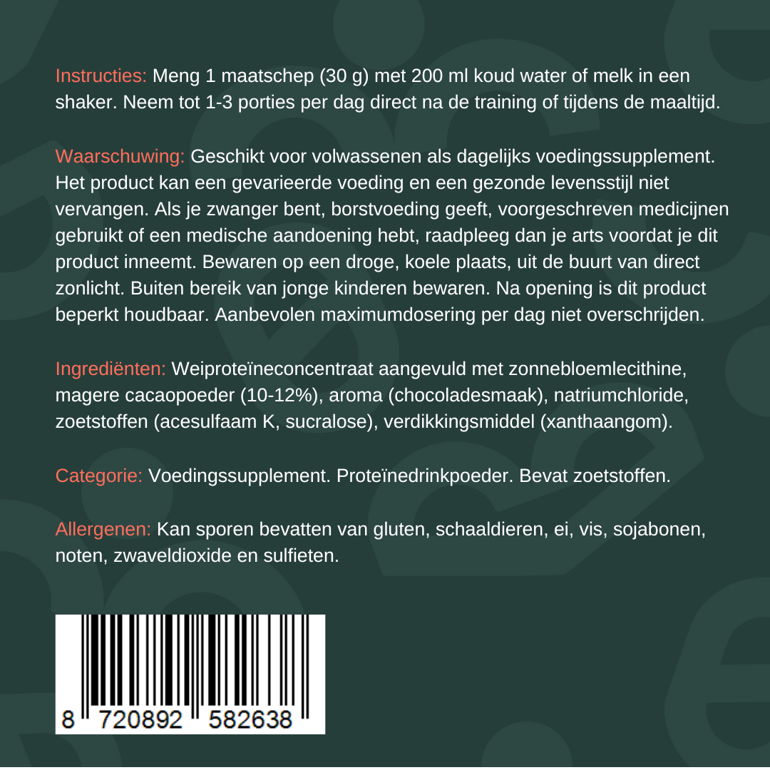 Weiproteïneconcentraat aangevuld met zonnebloemlecithine, magere cacaopoeder (10-12%), aroma (chocoladesmaak), natriumchloride, zoetstoffen (acesulfaam K, sucralose), verdikkingsmiddel (xanthaangom).