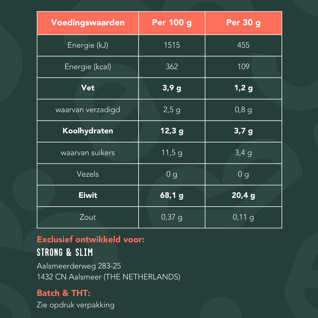 Gemak en veelzijdigheid – deze proteïnepoeder biedt niet alleen gemak, maar ook ongekende veelzijdigheid. Of je nu kiest voor een snelle eiwitrijke shake na je trainingssessie of het toevoegen van extra voedingswaarde aan je favoriete recepten, dit proteïneproduct past perfect in een actieve en gezonde levensstijl. Met Strong & Slim’s proteïnepoeder ben je altijd klaar voor een voedzame boost, waar en wanneer je maar wilt.